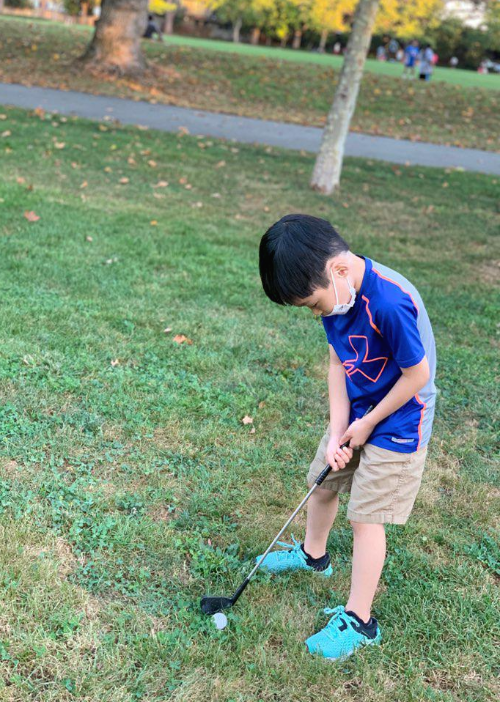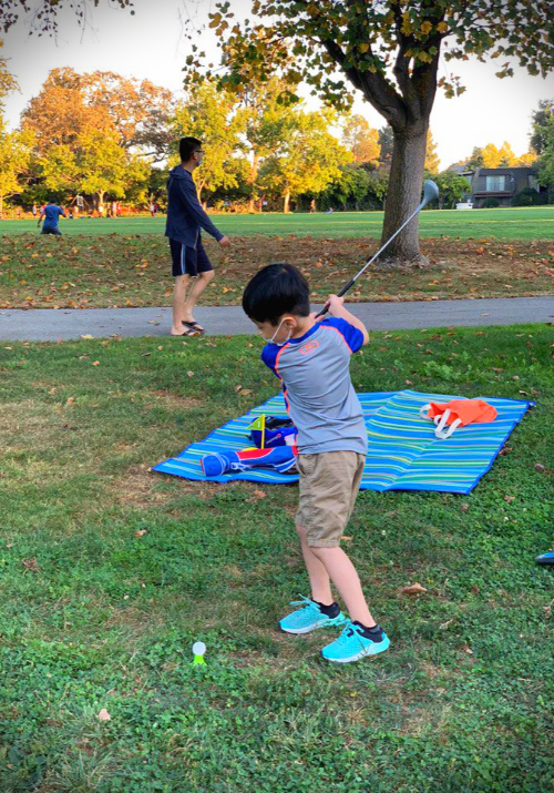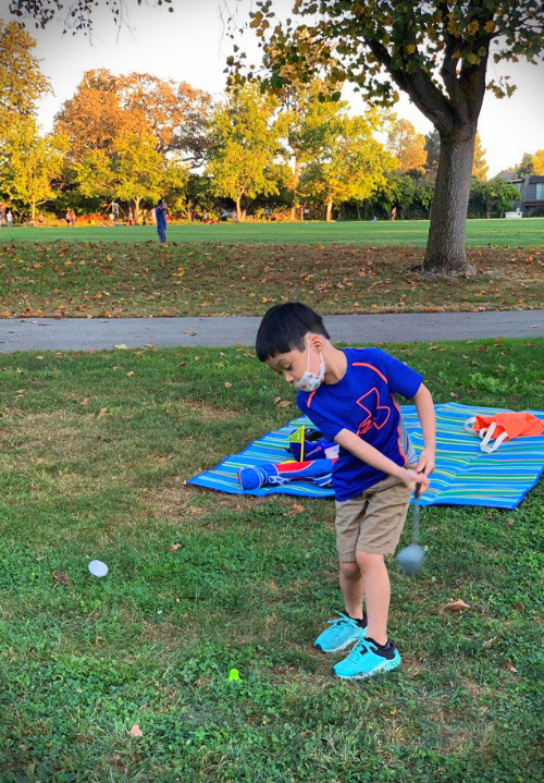 처음으로 쳐 보는 건데, 제법 공을 치고 재미있어 한다.