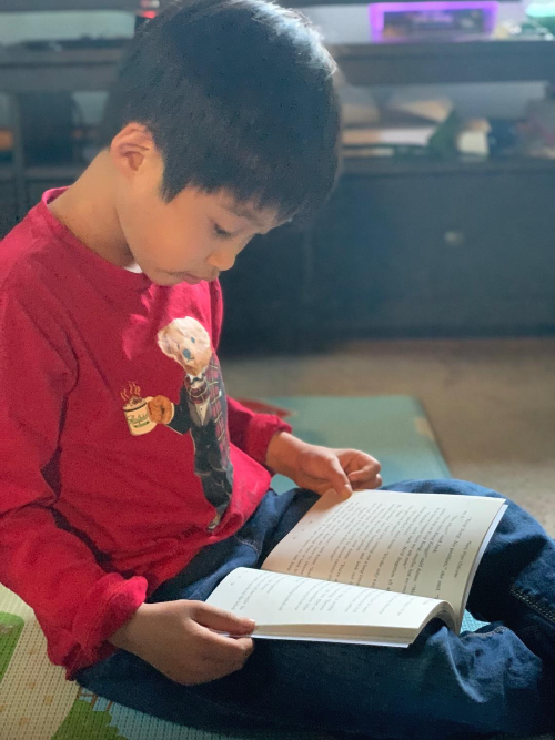 할아버지가 사 주신 책을 열심히 읽는 선재~