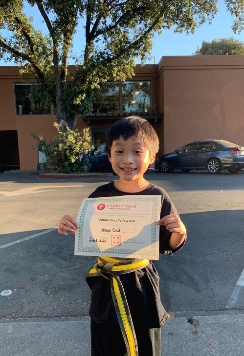 새로 받은 노란띠를 매고 승급증 들고 사진찍은 선재~